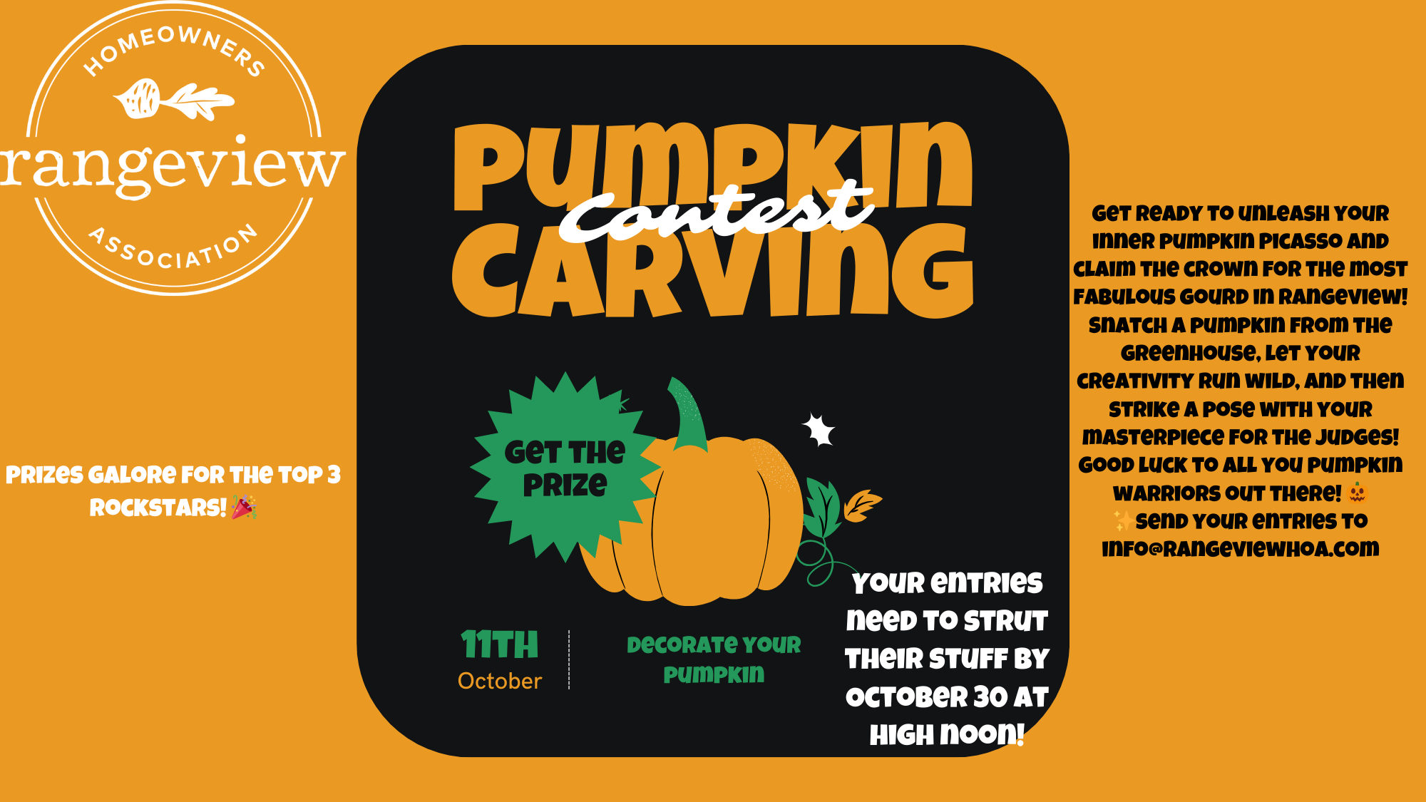 Get ready to unleash your inner pumpkin Picasso and claim the crown for the most fabulous gourd in Rangeview! Snatch a pumpkin from the greenhouse, let your creativity run wild, and then strike a pose with your masterpiece for the judges! Send your entries to info@rangeviewhoa.com by Oct 30/24 @Noon